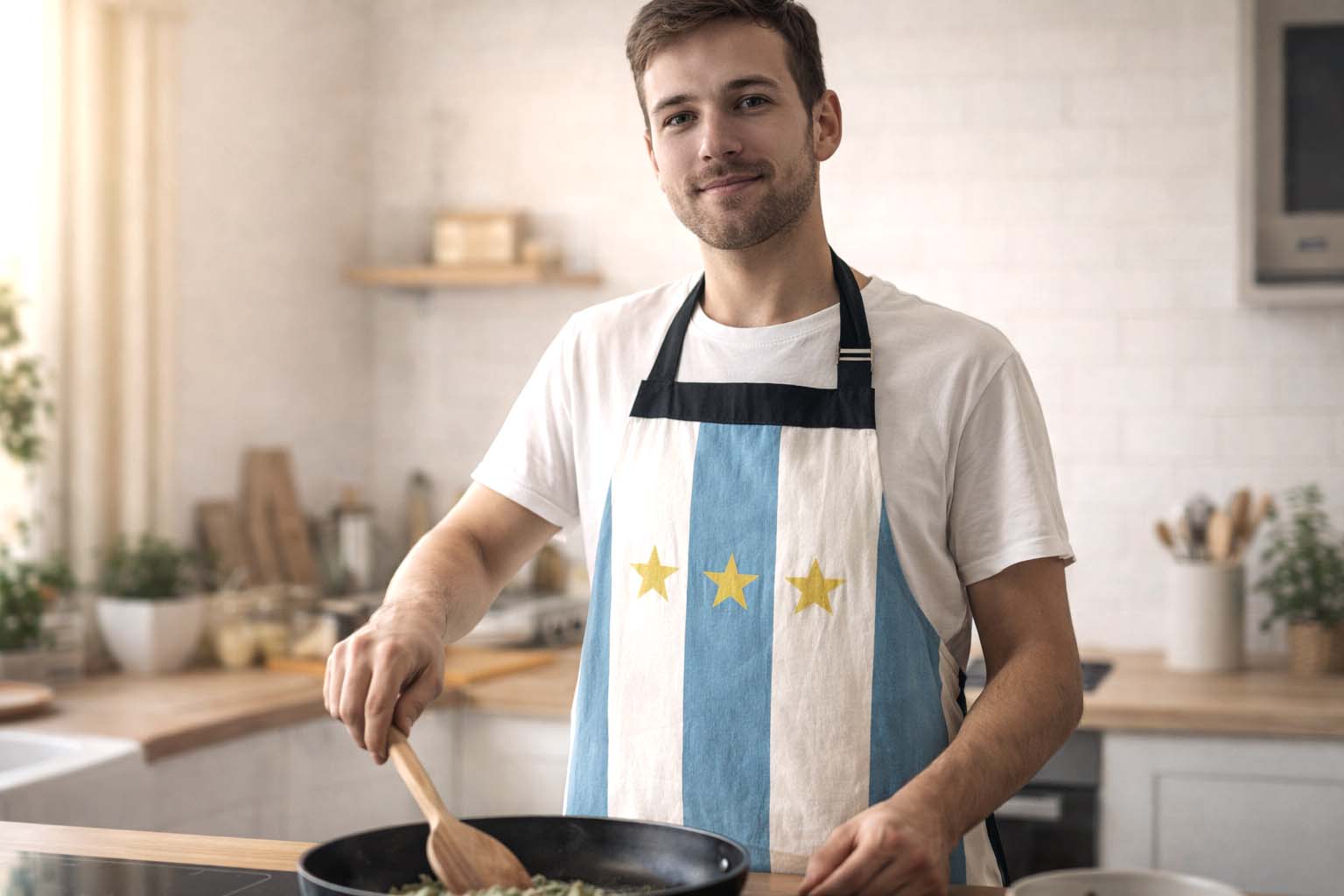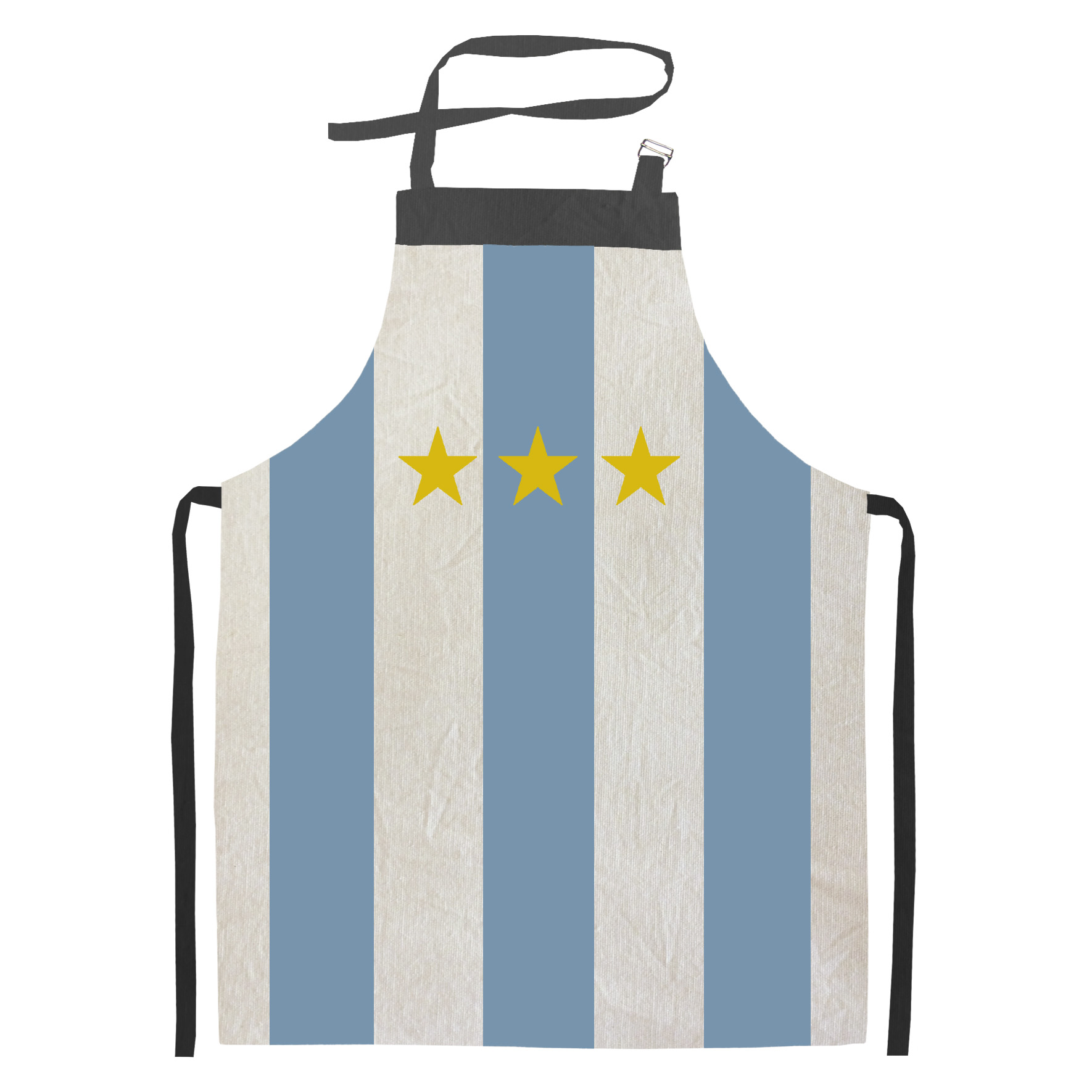 Viví el Mundial también en la cocina con este delantal de tusor en color natural, diseñado con las clásicas franjas celestes y blancas y el detalle de estrellas que nos llena de orgullo. Ideal para alentar, cocinar y compartir cada partido con toda la pasión argentina.