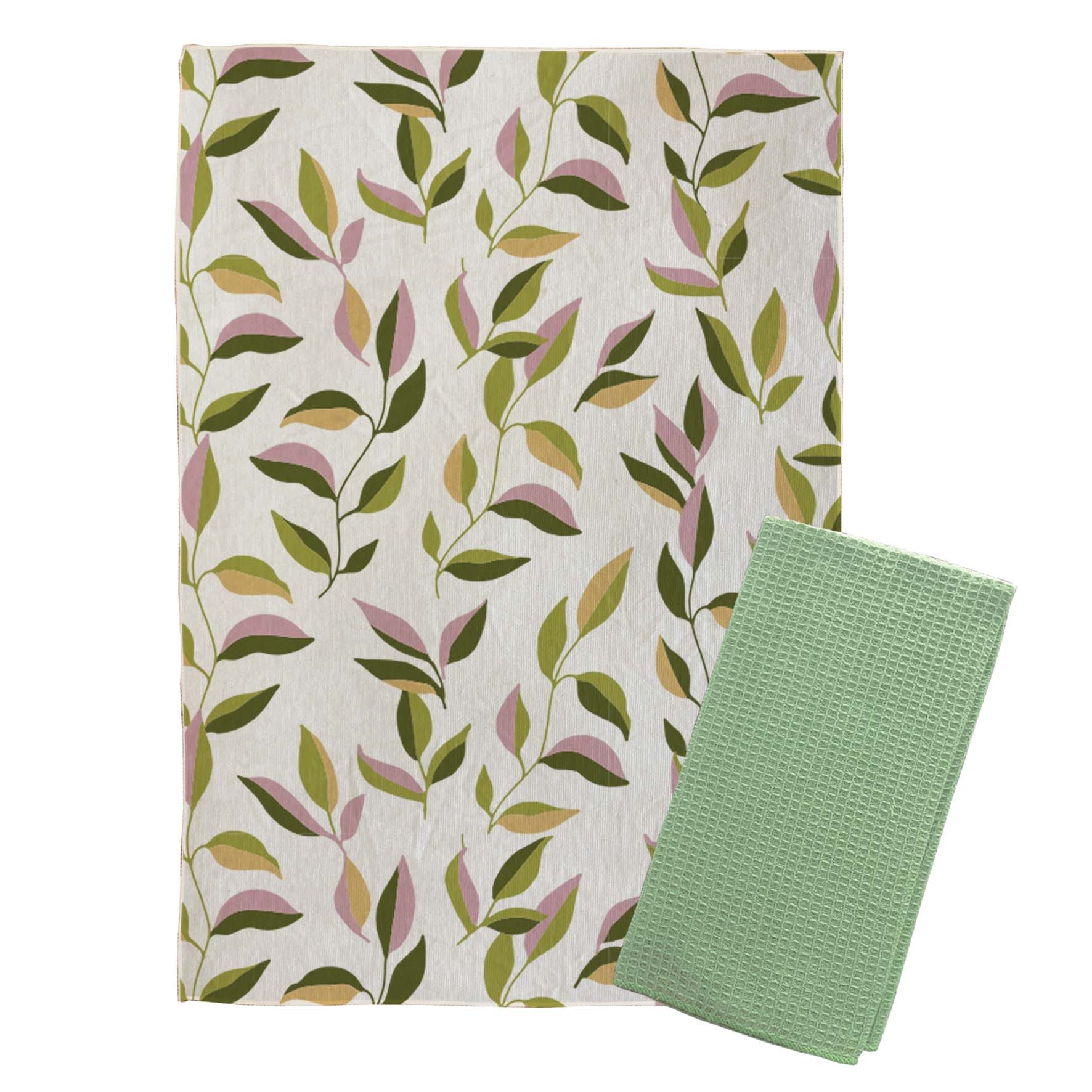 Set de repasadores compuesto por un repasador de tusor con estampa botánica en tonos verdes, rosados y mostaza sobre fondo claro, y un repasador de nido de abeja en color verde. Juntos forman una combinación perfecta de funcionalidad y estilo para tu cocina.