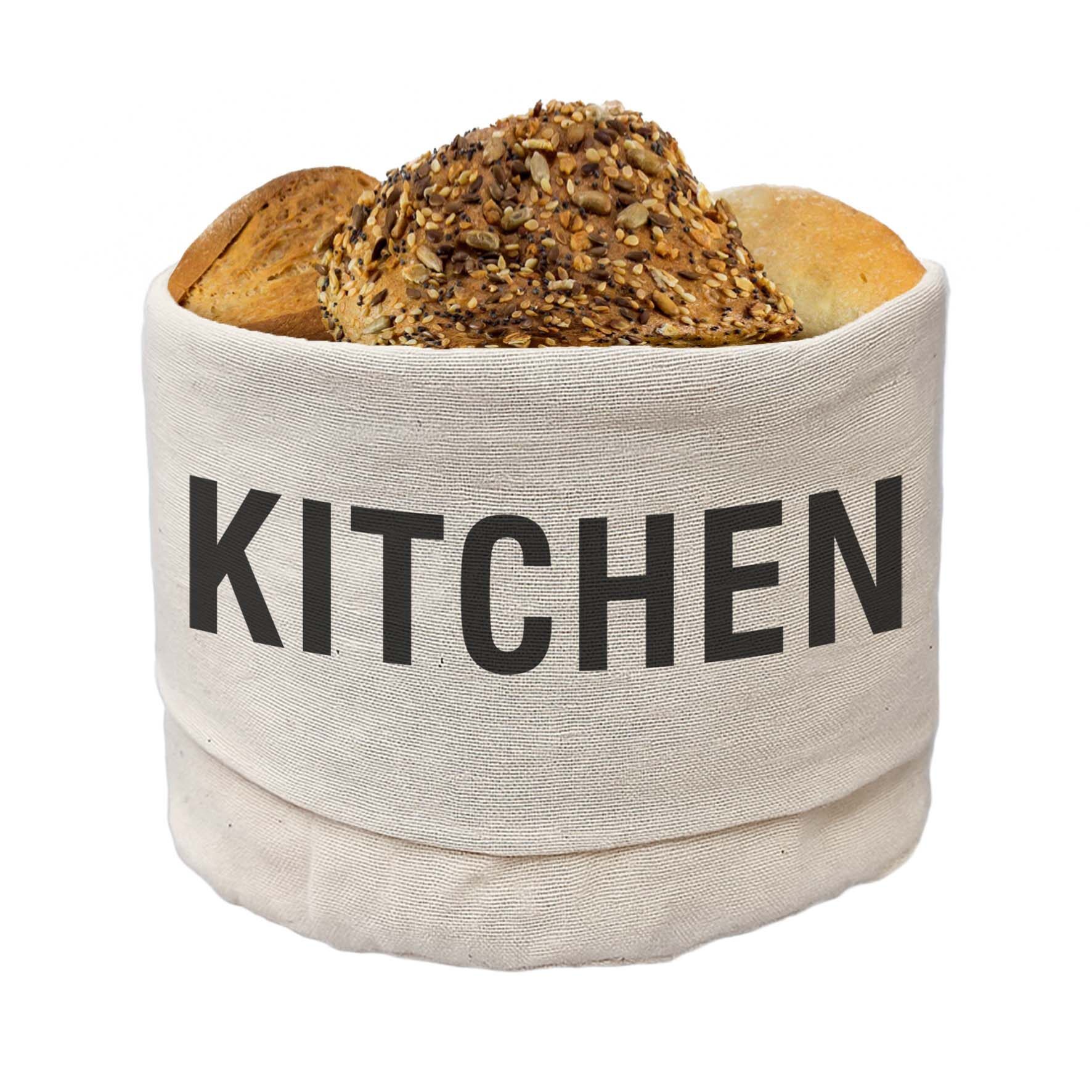 Panera de tela tusor en color natural con estampado negro, con un tamaño de 15 cm, perfecta para almacenar tu pan de manera ordenada. Hecha de algodón 100%, es suave, resistente y permite que el aire circule, manteniendo la frescura por más tiempo.