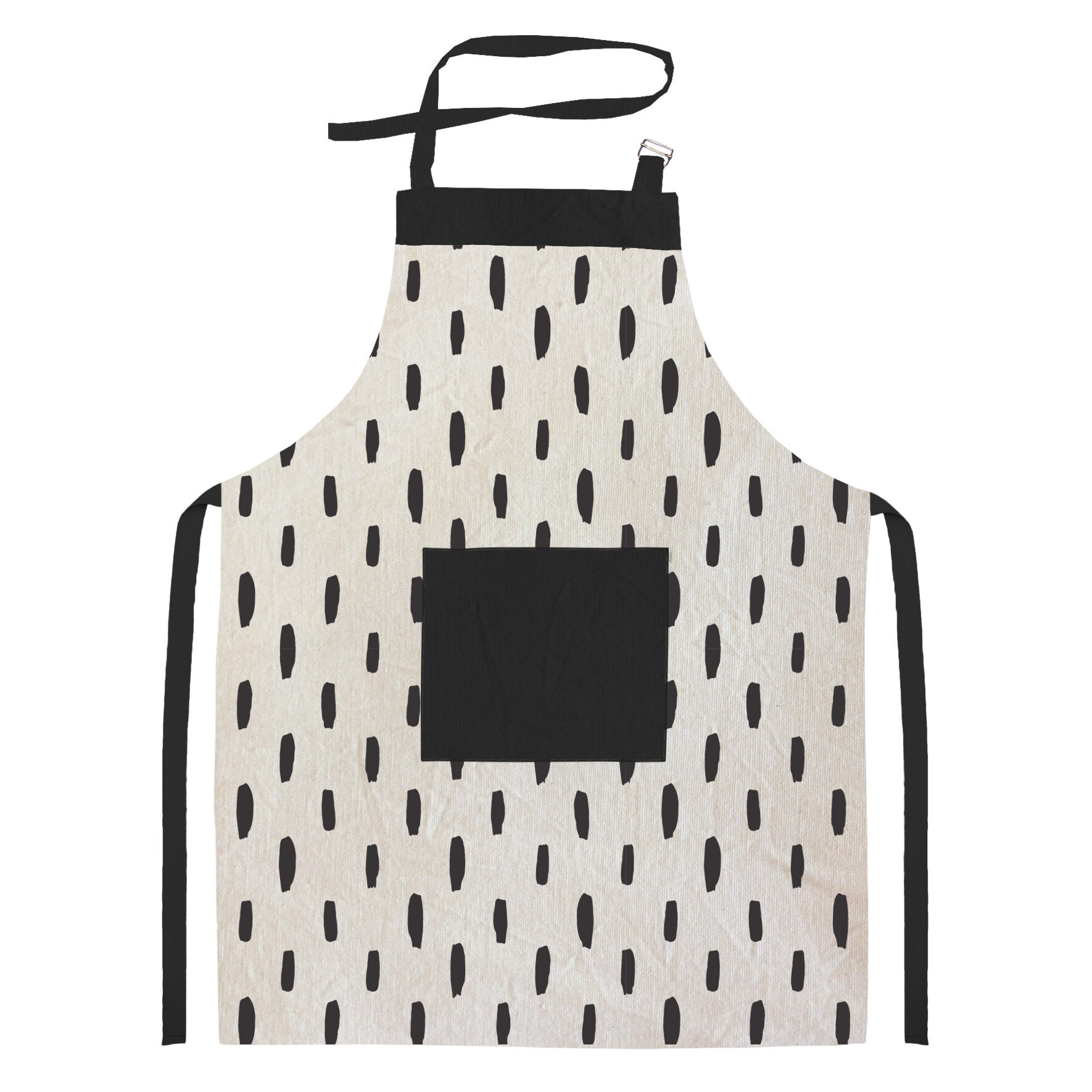 Delantal de tusor en color natural con estampado negro, diseñado para brindar comodidad y estilo en la cocina, el taller o cualquier actividad creativa. Confeccionado en tela liviana y resistente, protege de manchas y salpicaduras sin sacrificar movilidad.