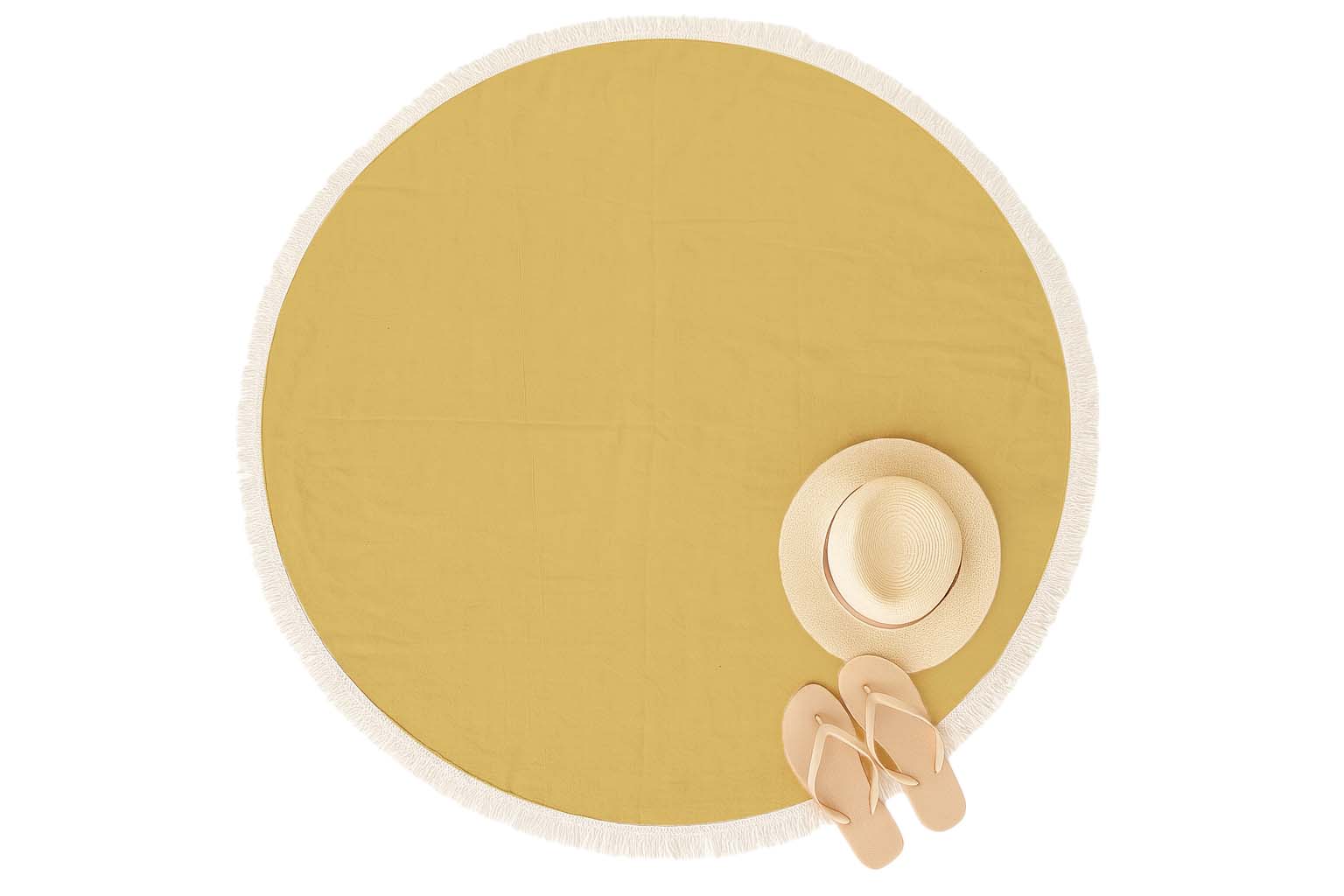 Disfrutá de un verano lleno de estilo con nuestra lona playera de tusor con flecos en color mostaza. Su diseño elegante y fresco, combinado con los flecos que le dan un toque único, la convierte en el complemento perfecto para tus días al sol.