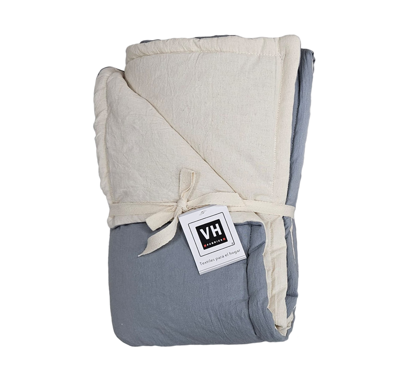Confeccionado en tela suave y resistente, es reversible, con un lado gris y otro natural, ideal para adaptarse a distintos espacios.