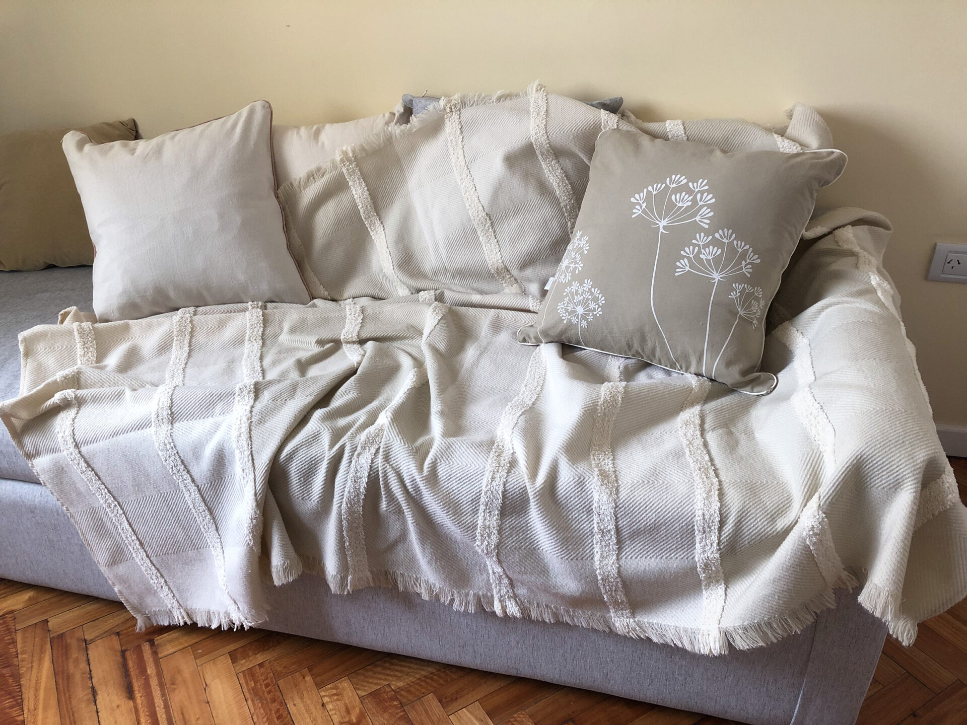 Dale un toque de calidez y estilo a tu hogar con nuestra manta jacquard tejida en tonos claidos y textura suave al tacto.