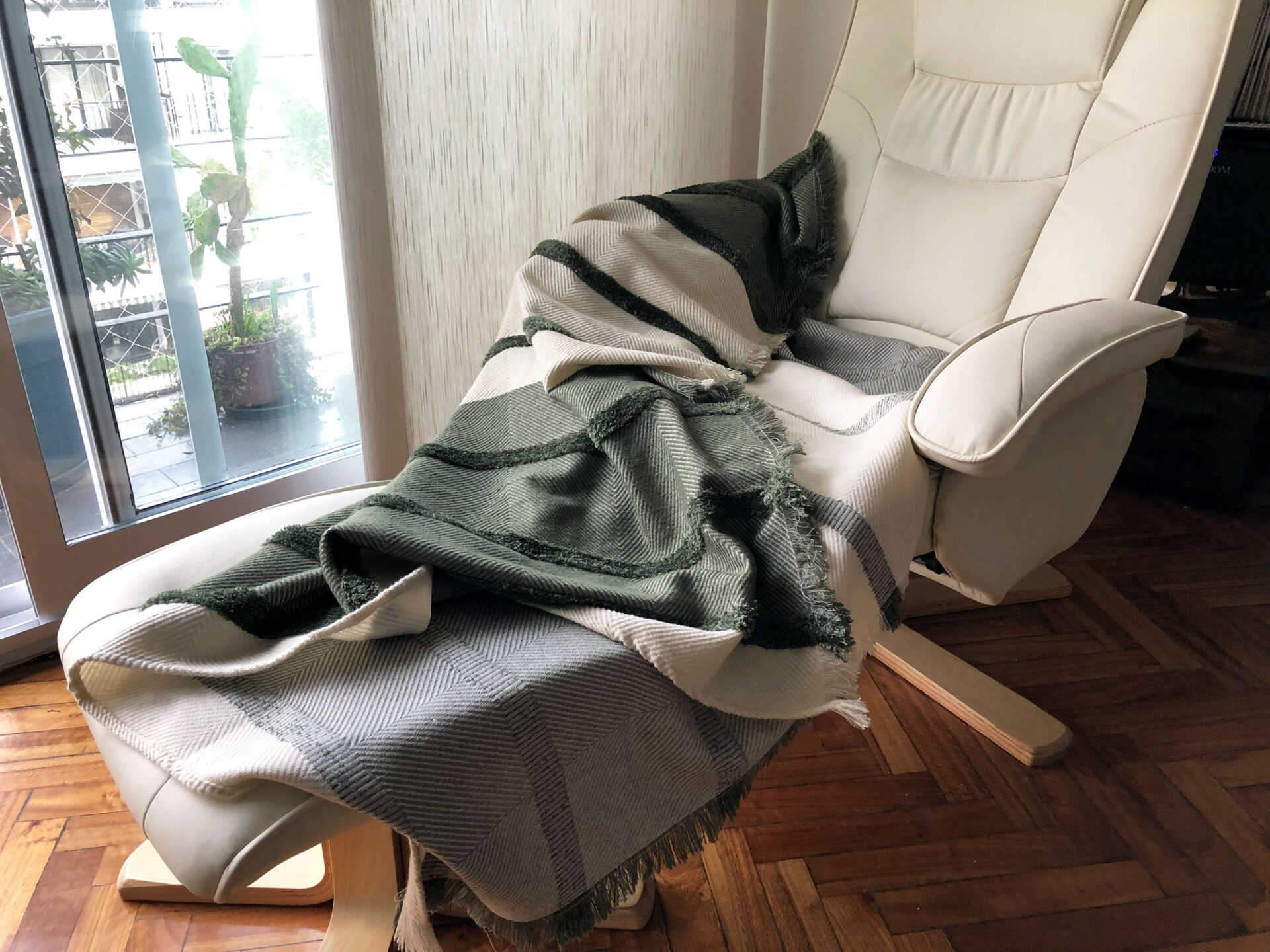 Dale un toque de calidez y estilo a tu hogar con nuestra manta jacquard tejida en tonos verdes y textura suave al tacto.