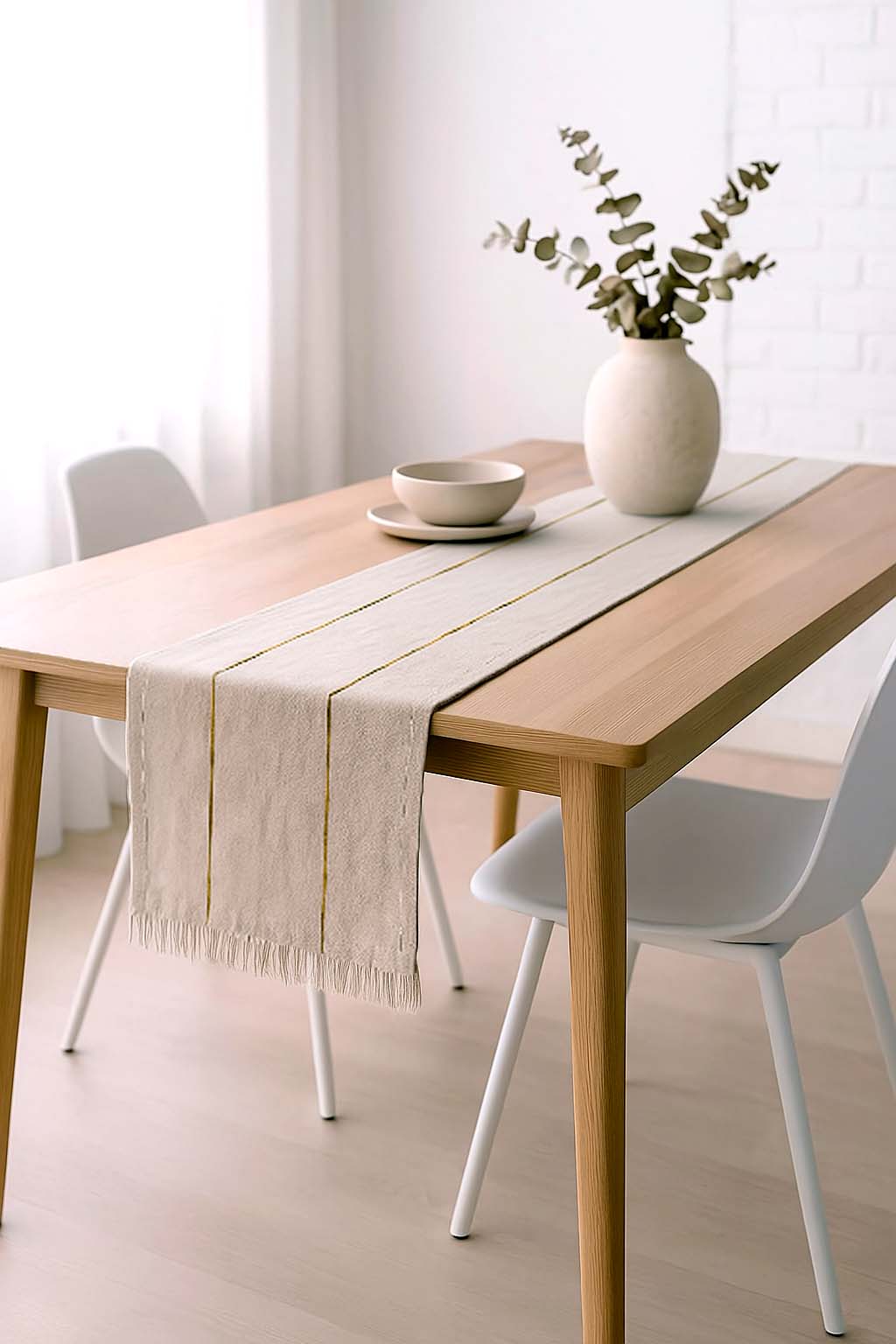 Este camino de mesa de tusor con flecos en las puntas y estampado de rayas doradas es la opción ideal para darle un toque natural y sofisticado a tu mesa. Su textura suave y su caída ligera aportan calidez y encanto, mientras que las delicadas rayas doradas añaden un brillo sutil que realza cualquier ambiente.